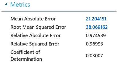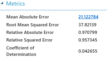 This number states that 3% percent of variance in the dataset can be explained by the variables in the model. Given that a Coefficient of Determination of 1 would mean a perfectly fitting model we have quite some way to go. Luckily, when clicking right on “Train Model” -> “Trained Model” -> “Visualize” we can get an idea of what we can do to improve the model.