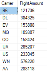 Let’s say in this case we take every Carrier that had more than 100.000 flights in the year 2013 and compare them to the baseline of airlines that were below 100.000. By checking the number of flights per airline we get this list of applicable airlines: