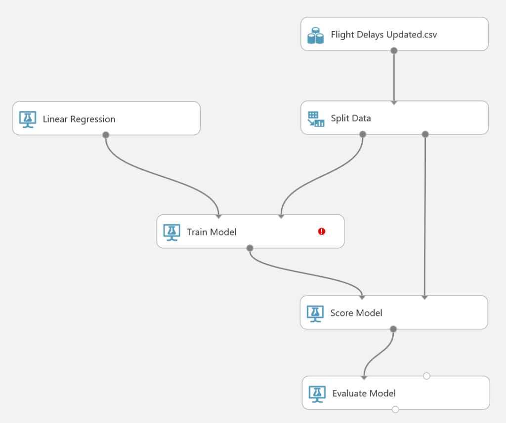 We go to “Machine Learning” -> “Train” -> “Train Model” to explicitly tell AMLS to create our model for us, after which we add “Machine Learning” -> “Score” -> “Score Model” and “Machine Learning” -> “Evaluate” -> “Evaluate Model”. After this we’re going to connect our steps so that we get the following image: